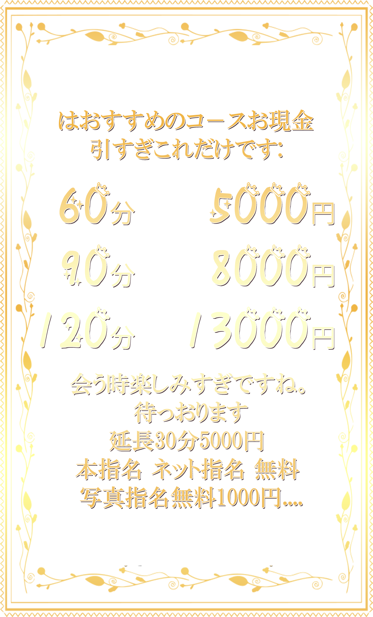 | 待 遇 | 完全全額日払い制 優しく笑顔でお客様に接客できる方、おしゃべりが好きな方。 出勤後に一時外出することもできます。 指圧整体等の経験者は優遇させていただきます。 |